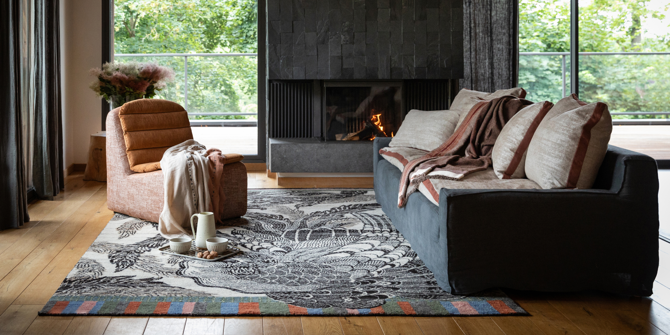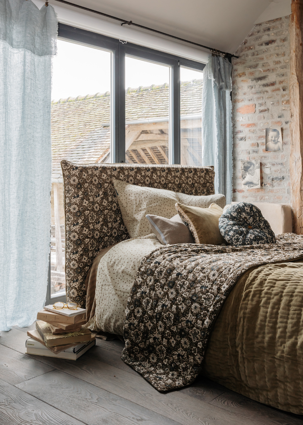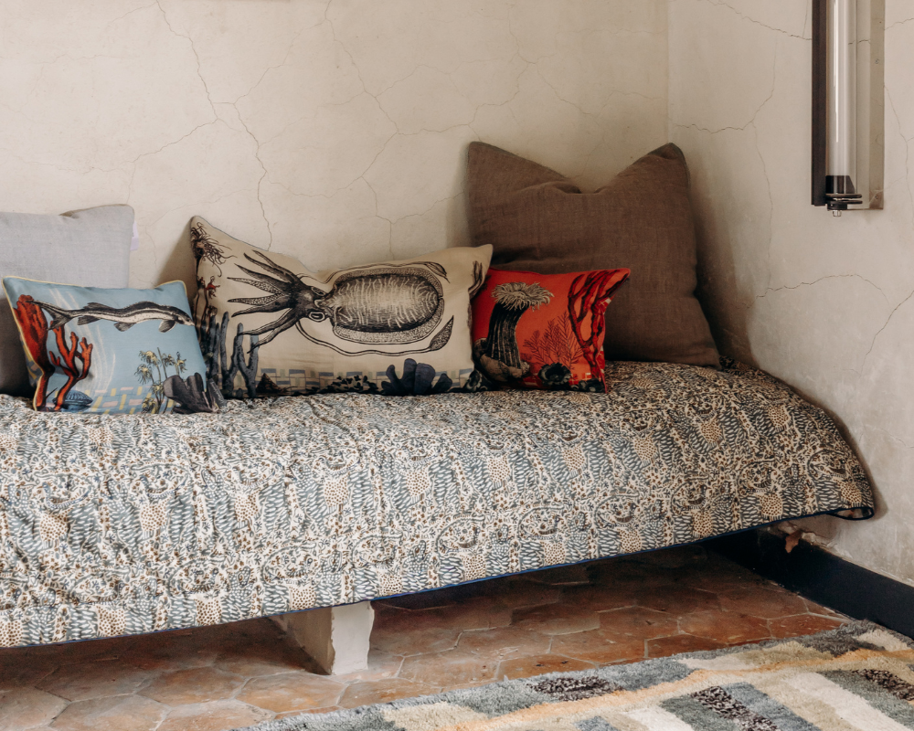 La finalité ? Sélectionner les meilleurs tissus à la source (comme la soie, le velours, la laine ou le lin) et les plus belles matières (bois massif, grès, céramique...) pour orner toutes les pièces de la maison. Rideaux, plaids et coussins s’invitent au salon, parure de lit dans la chambre, linge de table de belle facture côté cuisine et salle à manger, et bien sûr du papier peint all over !