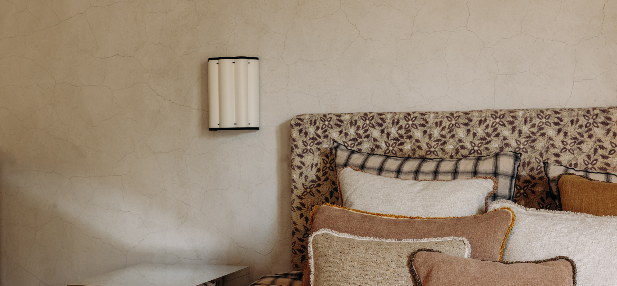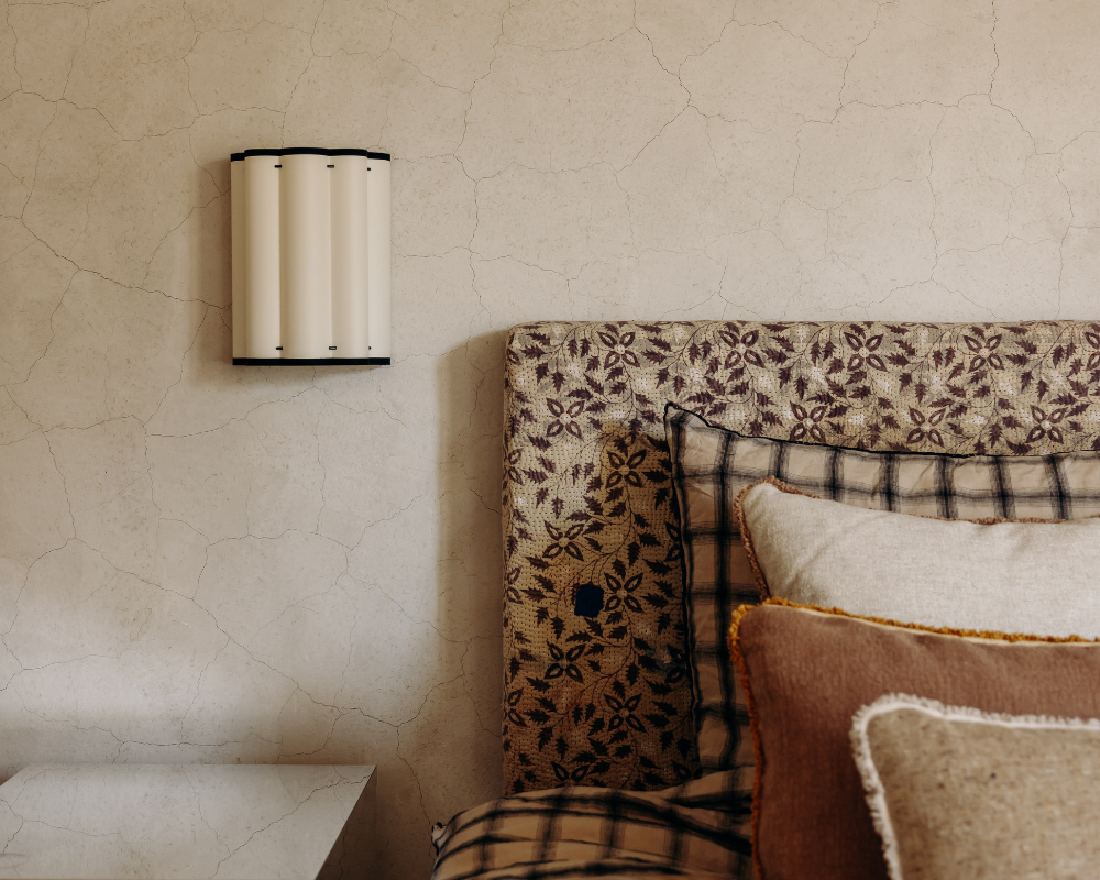 Applique Nuage en chintz gansé de noir pour en souligner les cannelures. Invitation à la rêverie au-dessus du lit ou accueil en douceur dans l’entrée ? L’applique Nuage impose sa poésie en délicatesse. Kit électrique 2 mètres inclus.