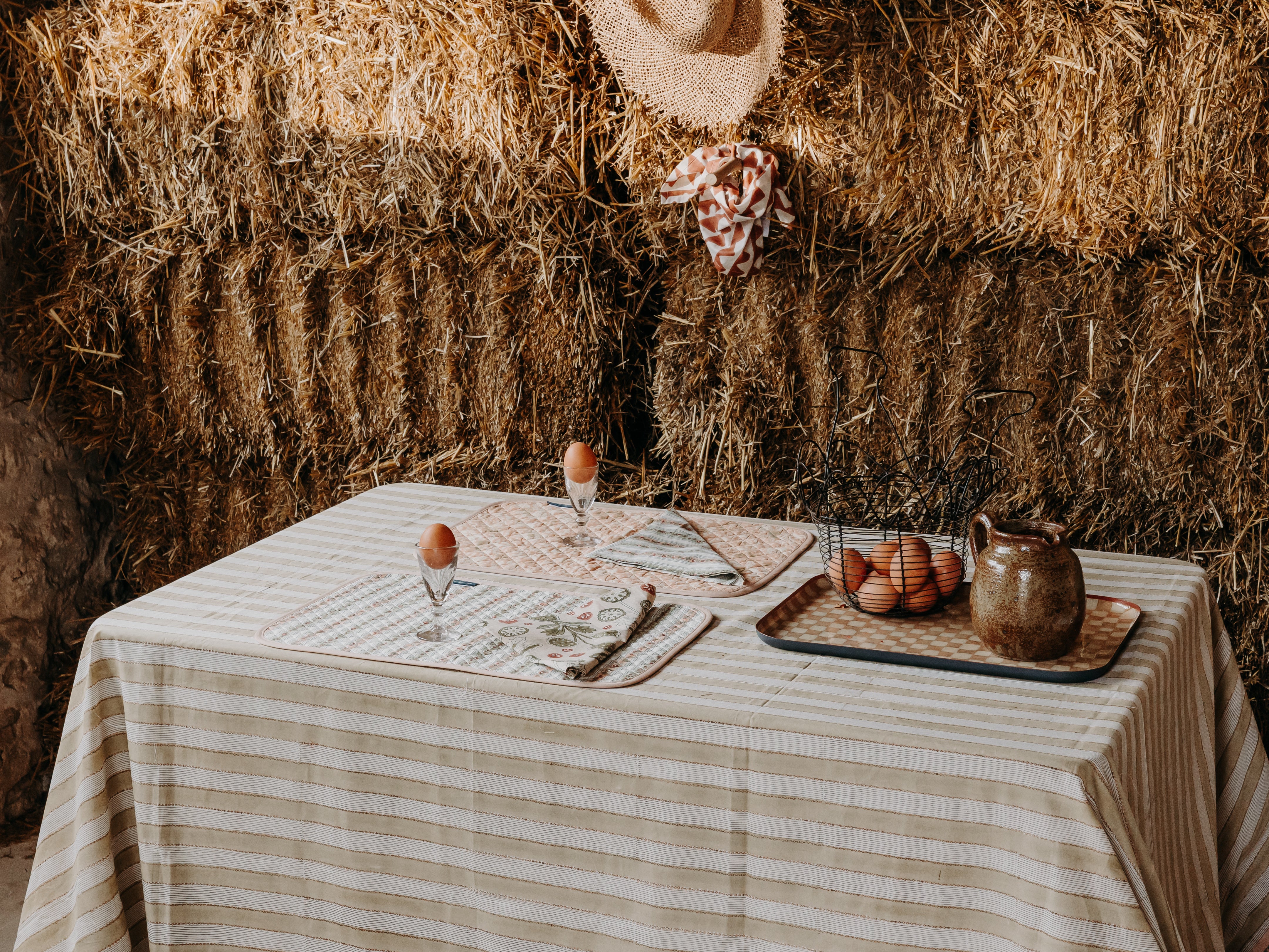 Véritable décor de table, la nappe Impro Corcovado déploie ses rayures graphiques bordées de fleurs. Imprimée selon la technique traditionnelle au bloc de bois, cette pièce artisanale en voile de coton aérien apporte une sensation de légèreté et de douceur. Ingénieuse, elle se glisse partout : dans le sac de plage en guise de paréo, dans le panier de pique-nique, comme petit rideau...