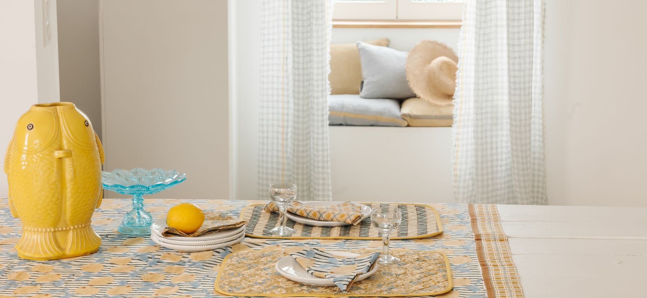 Véritable décor de table, la nappe Impro Sicily est une explosion de citrons d’un jaune intense qui reflète la générosité du soleil sicilien. Imprimée selon la technique traditionnelle au bloc de bois, cette pièce artisanale en voile de coton aérien apporte une sensation de légèreté et de douceur. Ingénieuse, elle se glisse partout : dans le sac de plage en guise de paréo, dans le panier de pique-nique, comme petit rideau...