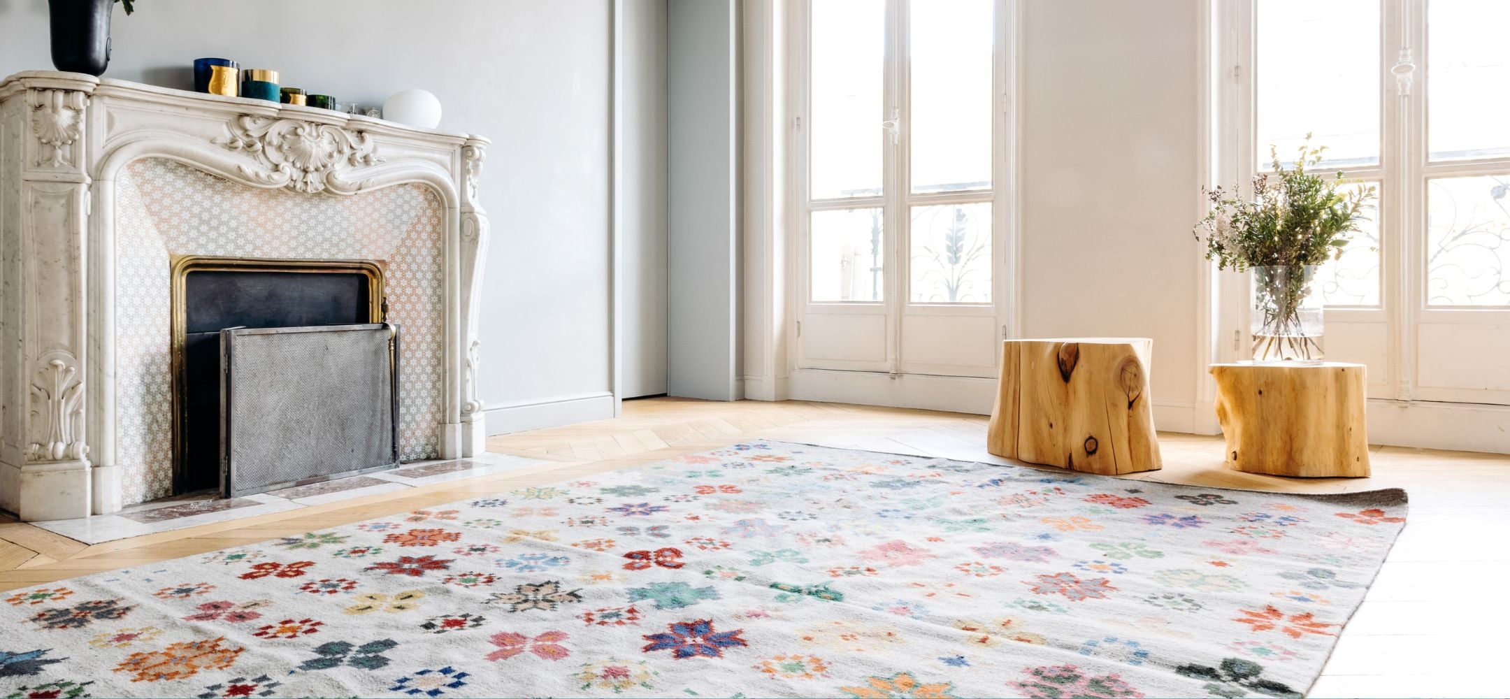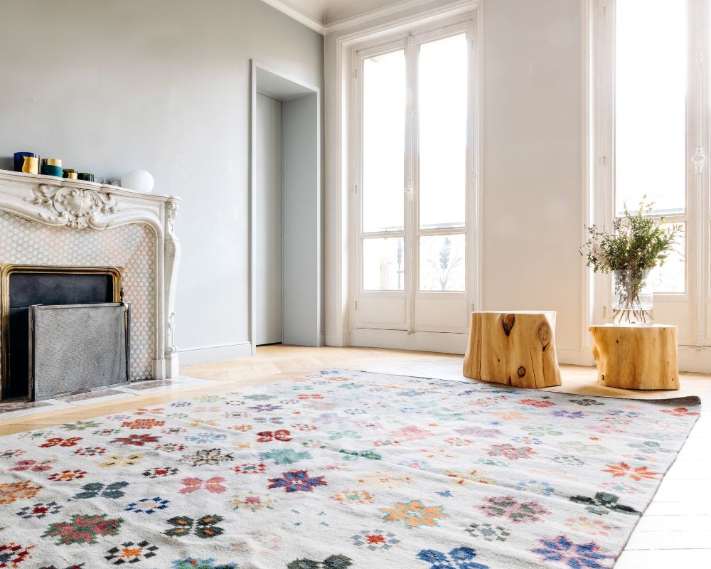 Le tapis Millefleurs porte bien son nom, décoré d’un festival de fleurs toutes différentes. La bande foncée ajoute un côté unique à ce tapis artisanal.