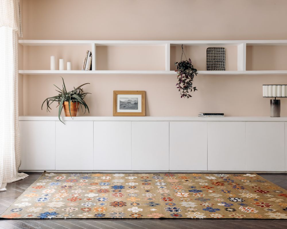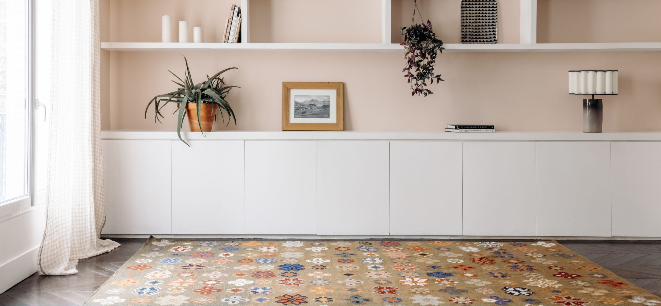 Le tapis Millefleurs porte bien son nom, décoré d’un festival de fleurs toutes différentes. La bande foncée ajoute un côté unique à ce tapis artisanal.