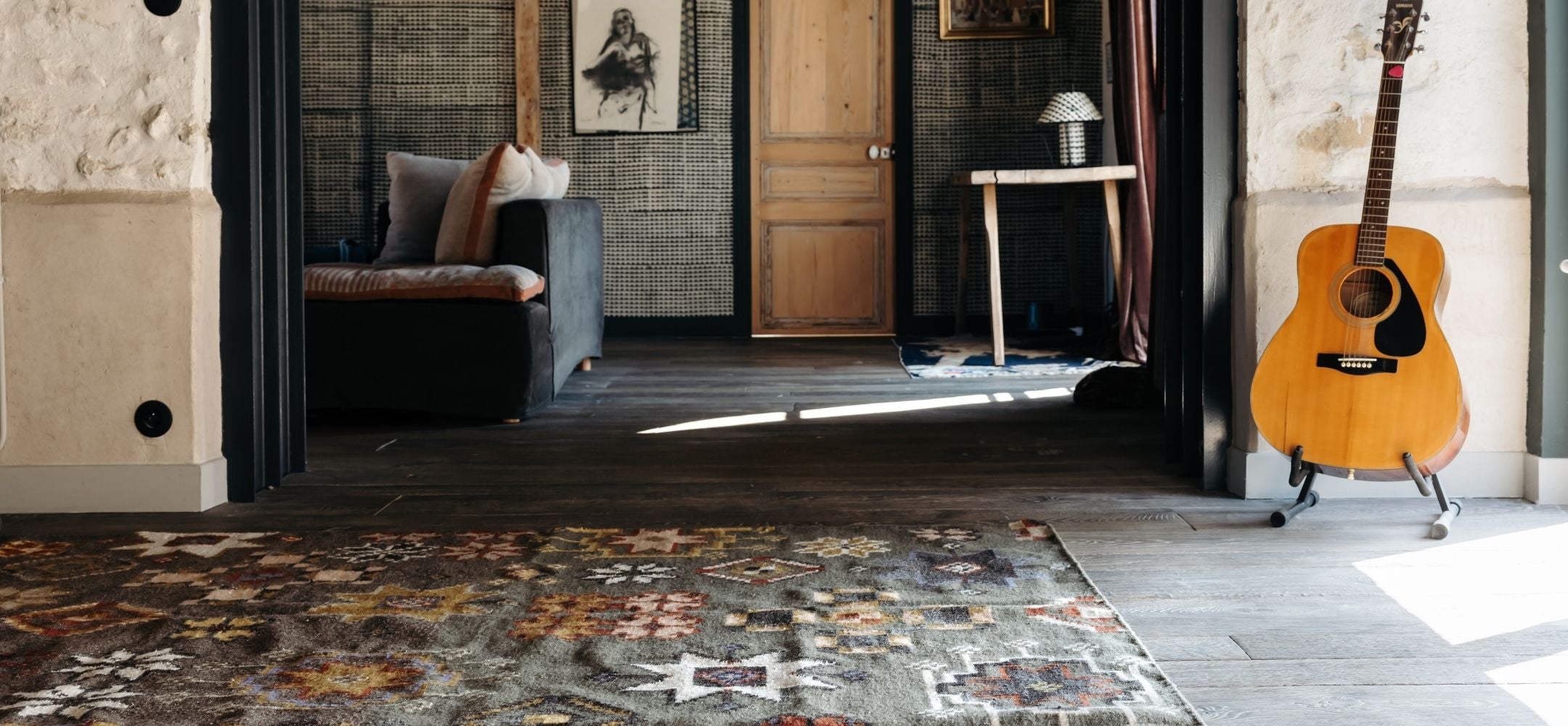 Le tapis Danube offre une lecture moderne avec son rendu graphique pixellisé.