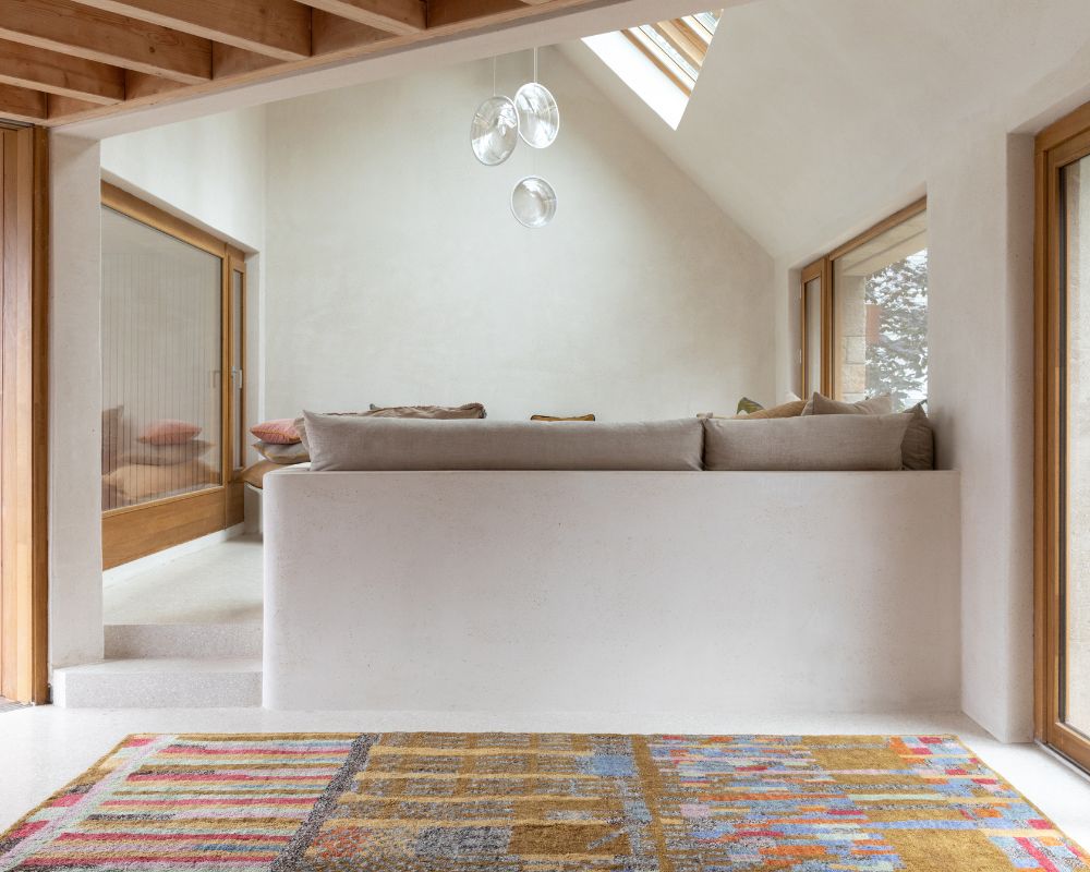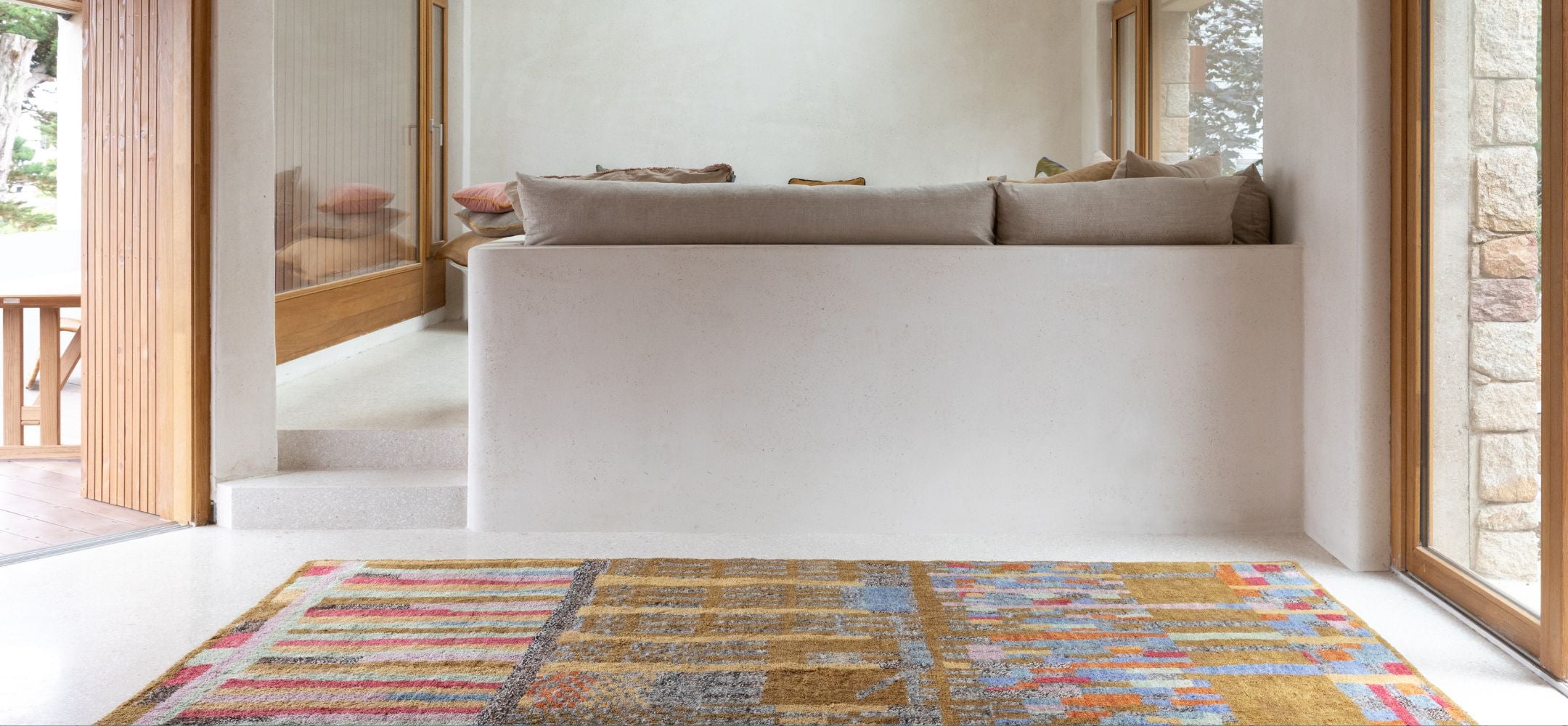 Tapis 100 % laine au style graphique et au toucher soyeux.