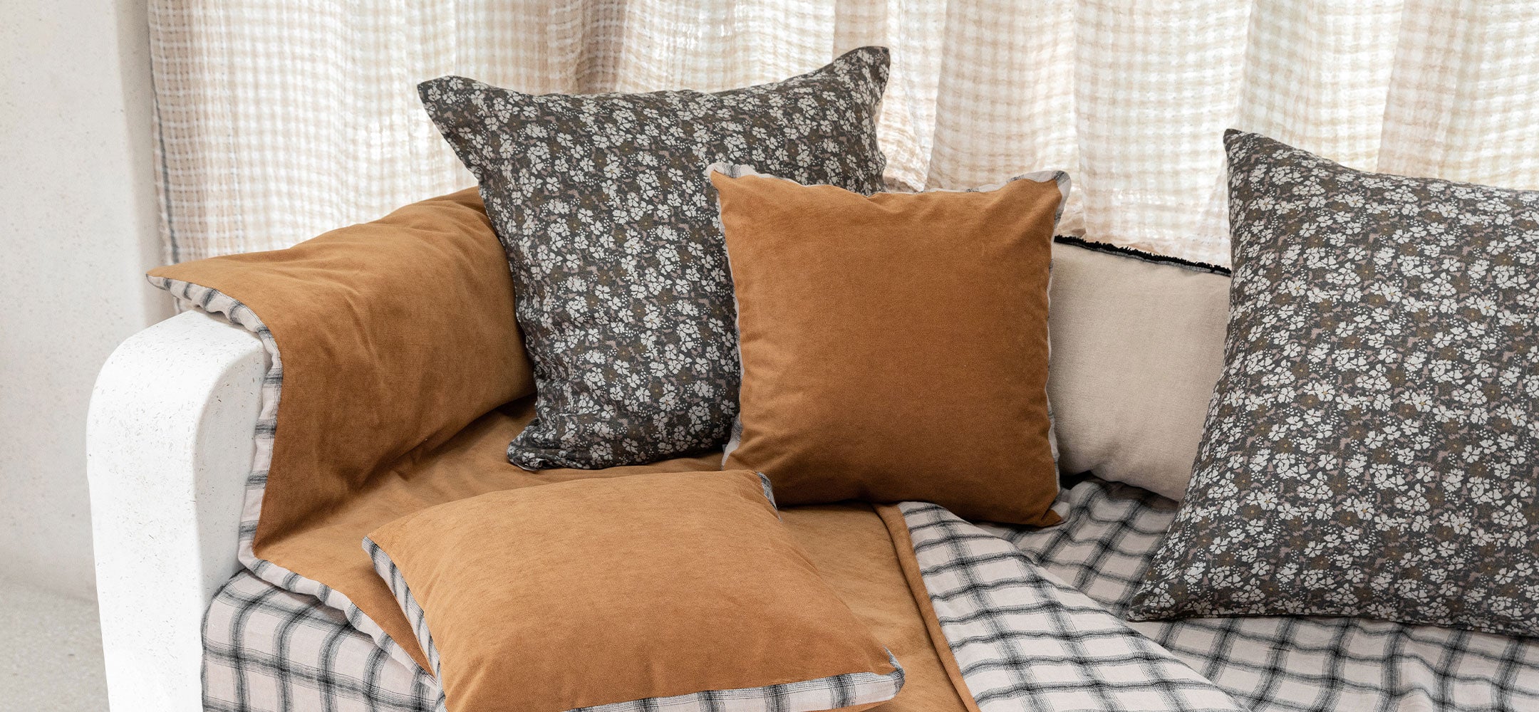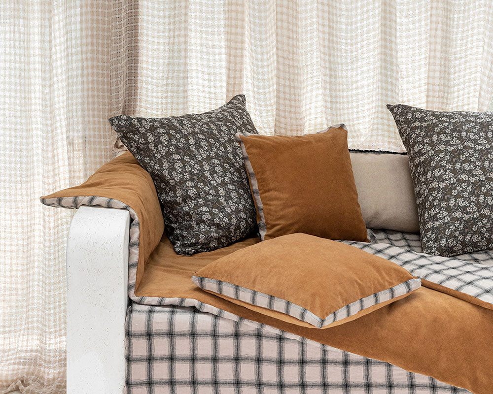Velvet and linen make for a singularly beautiful combination. The Charlie cushion with the Highlands border is the perfect example. The iconic LMS tartan fabric provides a striking contrast to the subtle beauty of the velvet. The Charlie eiderdown and cushion together are the perfect way to give a new look to a sofa. They can also transform bench seating into a cosy corner.
