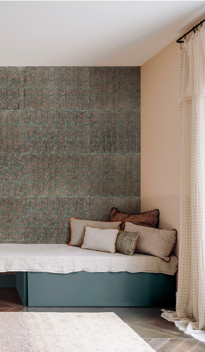 From the entrance to the bedroom and on into the living room, the LMS wallpaper collection brings colour and pattern to every wall in the house. The range is composed of fifteen papers in strong shades that work as well on the walls as on the ceiling, behind the bed, on the door of a cupboard, on the back panel of a bookshelf or in a forgotten corner.ARTISANAL CHIC Behind every luxury product is an artisan whose work makes each item unique, even sometimes perfectly imperfect. The patterns are created by our design studio and printed via wooden blocks onto rice paper using the batik technique. What’s rare is by definition precious and our wallpaper is both. Our black triangles, chestnut squares and sable coloured diamonds are motifs that create a powerful effect. If you are dreaming of something softer and more natural, our jungle, floral or sunray prints will bring the outside into your home. Whether you prefer deep or pastel colours, natural or graphic prints, the choice is yours (as long as you are prepared to forego a plain white wall that is ;)). With its perpetual dialogue between pattern and colour, our wallpaper collection is a maximalist’s dream!